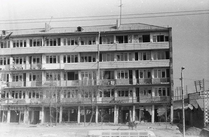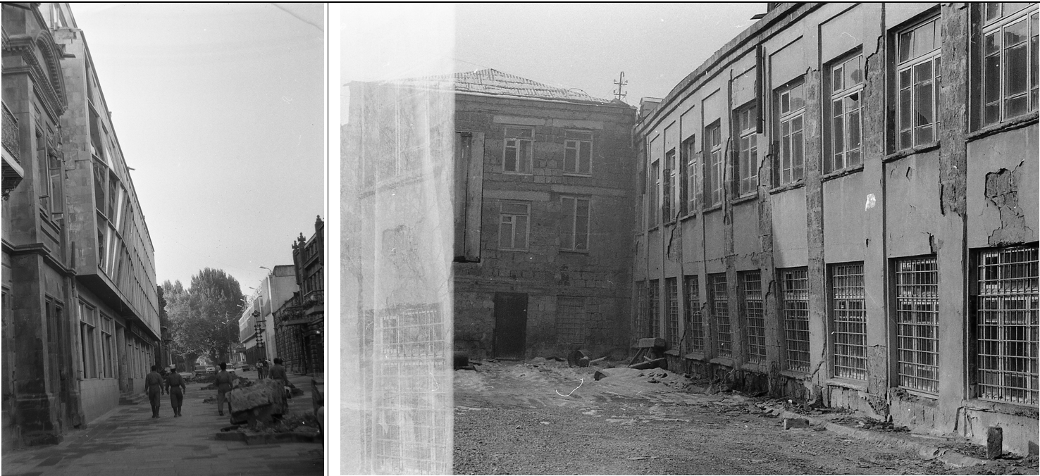 Общежитие по диагонали пересекла та аномалия, что разрушила школу. Но! На уровне межэтажных перекрытий и под коньком 4-го этажа в здании были устроены монолитные железобетонные пояса, а стены были сложены из туфа. В итоге – здание почти не пострадало. Это второе здание (первое – на территории мебельной фабрики в г. Ахуряне) в котором железобетонные пояса толщиной в 30 см сохранили здание. То есть, таких поясов оказалось достаточно.