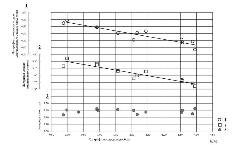 За счет повышенного в формуле (4) значения n линия регрессии 1 на рис. 3 проходит круче, увеличивая тем самым значения Q малой обеспеченности, предотвращая их занижение.