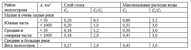 Получены районные значения параметров кривых обеспеченности Cv и Cs/Cv слоя стока и максимальных расходов воды рек разных размеров и ручьев в зависимости от их местонахождения на полуострове.