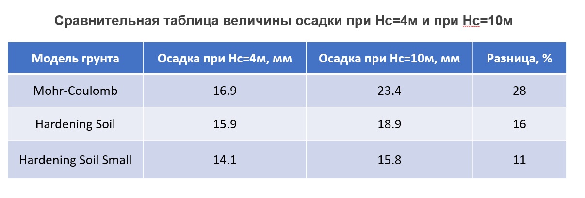 Для модели MC для сжимаемой толщи 4 м была получена осадка 16.9 мм, а для сжимаемой толщи 10 м — 23.4 мм, разница в 28%; для модели HS для сжимаемой толщи 4 м осадка составила 15.9 мм, а для сжимаемой толщи 10 м — 18.9 мм, разница в 16%; для модели HSS для сжимаемой толщи 4 м была получена осадка 14.1 мм, а для сжимаемой толщи 10 м — 15.8 мм, разница 11%.