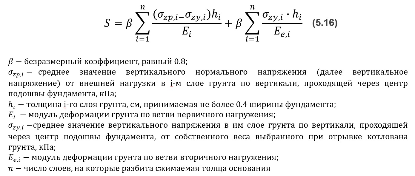 Расчет величины осадки был выполнен по формуле 5.16, показанной на рисунке 9. Второе слагаемое при котловане глубиной меньше 5 метров допустимо не учитывать, но для наиболее корректного сравнения эта составляющая была учтена.