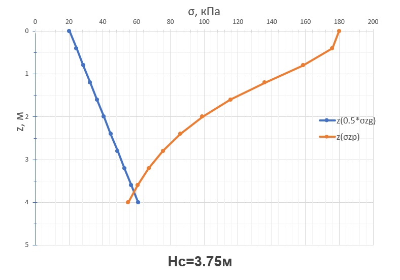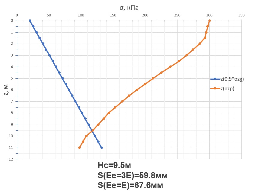 Аналитическим методом была рассчитана величина сжимаемой толщи, которая составила 9.5 м, см. рисунок 16. Осадка при Ee=75 МПа составила 59.8 мм, а при Ee=25 МПа — 67.6 мм.