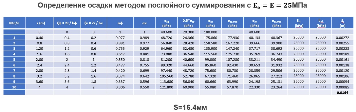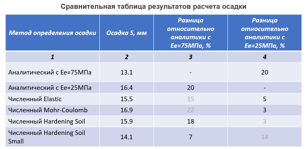 Рис. 14. Сравнительная таблица расчета осадки разными методами