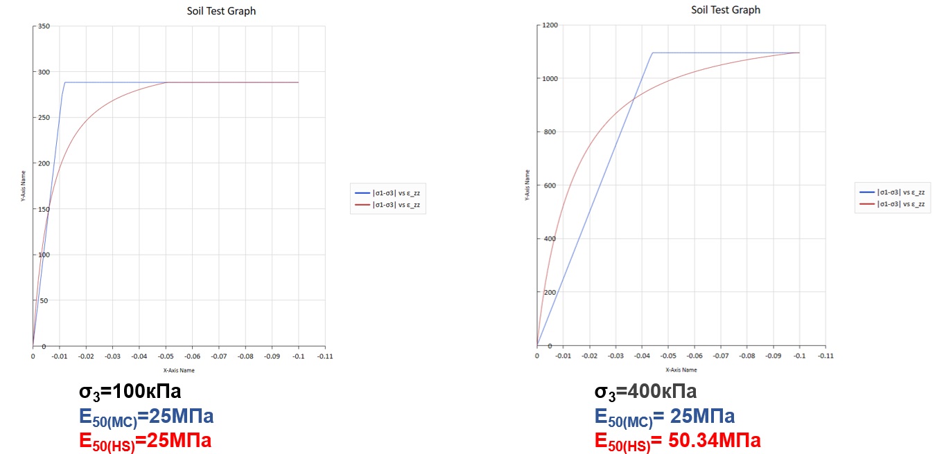 В одометре у грунта нет возможности бокового расширения, но в некоторых задачах очень большое значение имеет и корректный учет другой траектории нагружения: например, оценка влияния при откопке котлована. В «Soil Test» были проведены трехосные виртуальные испытания грунта для модели HS и MC при разных значениях бокового напряжения. При боковом напряжении в 100 кПа был рассчитан тангенс угла секущей, который соответствует 50%-ой прочности образца при заданном боковом напряжении в 100 кПа, и таким образом было получено значение модуля деформации E50=25 МПа для модели MC и модели HS — это вводные характеристики, см. рисунок 20. Для бокового напряжения в 400 кПа для HS был получен E50=50.34 МПа, а для MC E50 не изменился и составил E50=25 МПа, см. рисунок 20. Из этих графиков видно, что E50 для HS при разных боковых напряжениях будет отличаться, а для MC — данный модуль постоянная величина. Также из графиков видно, что при росте вертикального напряжения (девиатора) при неизменном боковом напряжении значение тангенса угла касательной к графику, характеризующему HS, уменьшается (жесткость уменьшается с ростом девиатора), а для модели MC — это постоянная величина до разрушения образца.