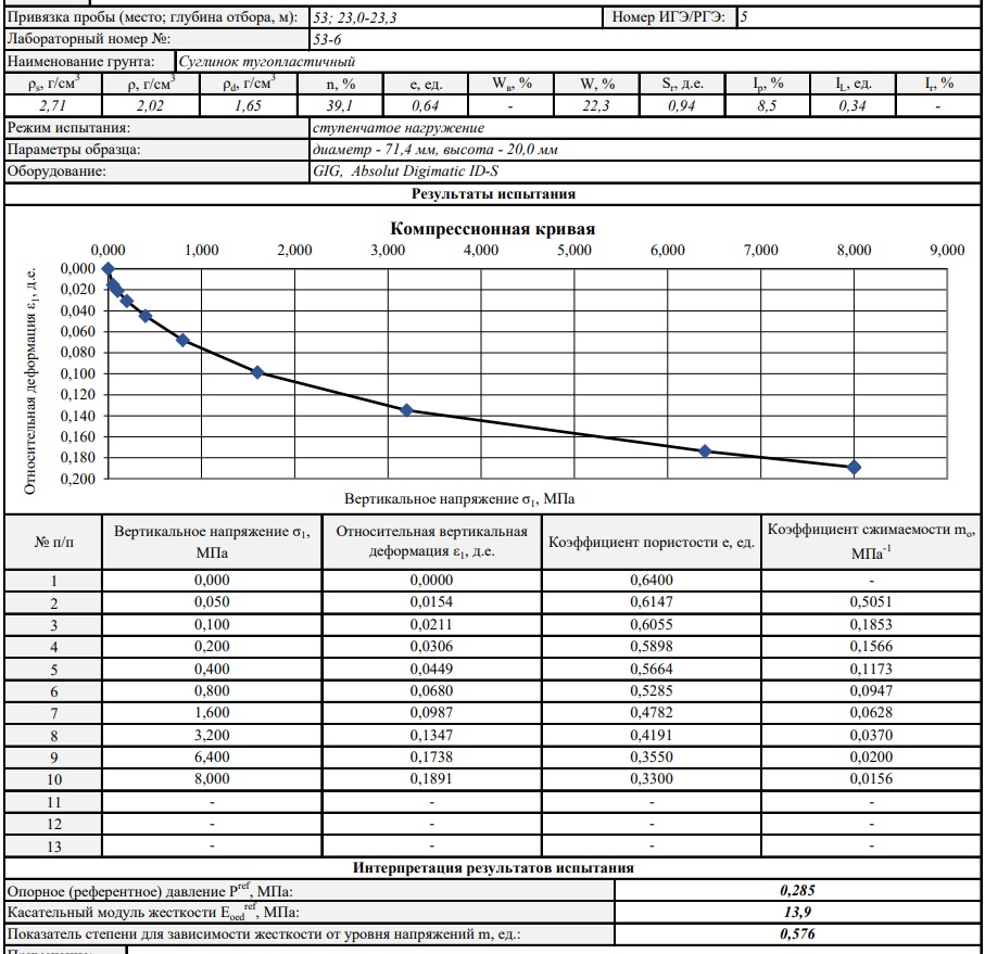 Рис. 21. Пример испытания грунта методом компрессионного сжатия с определением Eoed и m. Исполнитель: Мостдоргеотрест