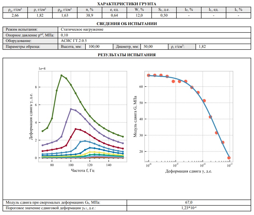 Рис. 24. Пример испытания грунта методом малоамплитудных динамических колебаний в резонансной колонке с определением Small Strain Paramу. Исполнитель: Мостдоргеотрест