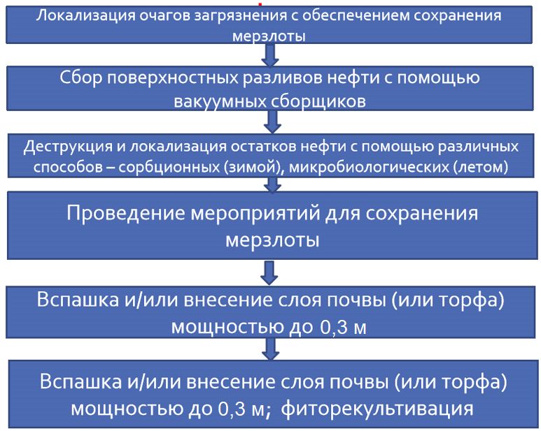 2. В условиях криолитозоны в схему рекультивации территорий с поверхностными разливами нефти входят следующие этапы: (рис. 2):