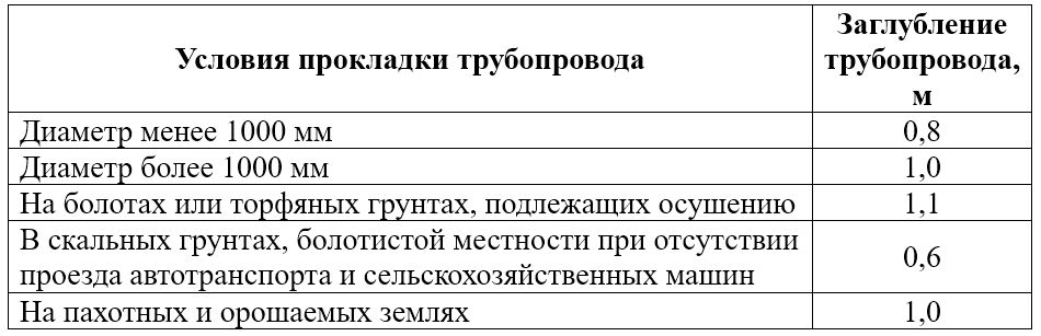 Заглубление трубопроводов до верха трубы принимается согласно параметрам, указанным в таблице 1.