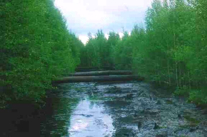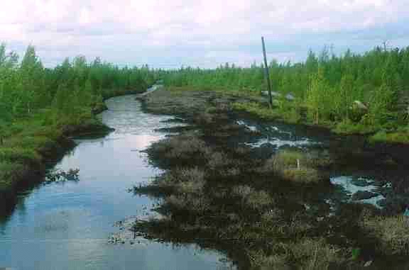 Рис. 12. Обнажение труб и пролив нефти на трубопроводе Самотлорского месторождения (фото Е.А. Вознесенского, 1999 г.)