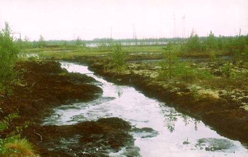 Рис. 10. Проливы нефти вдоль трассы нефтепровода на Самотлорском месторождении в Западной Сибири (фото Е.А. Вознесенского, 1999 г.)
