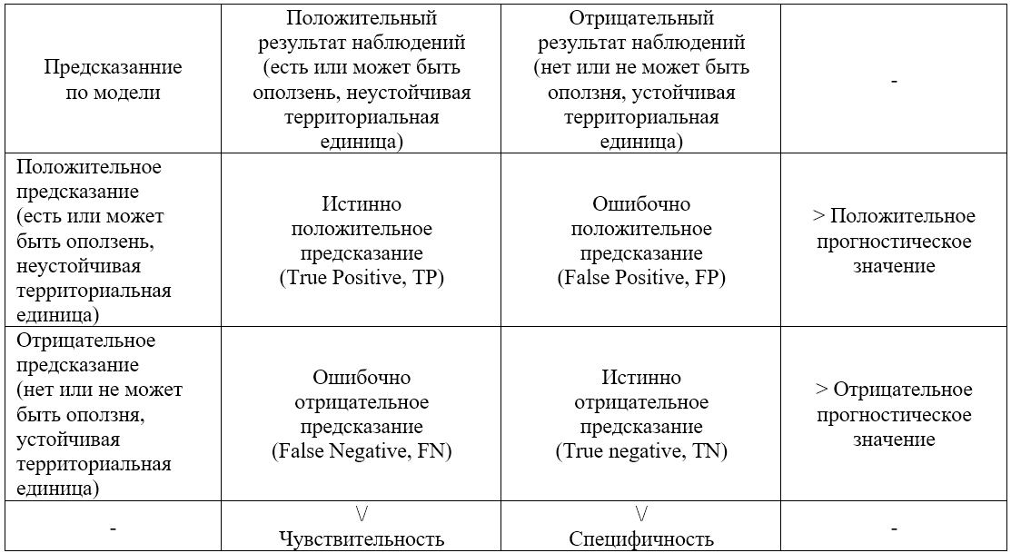 Таблица 20. Таблица сопряженности, используемая для оценки эффективности предсказаний по модели оползневого зонирования