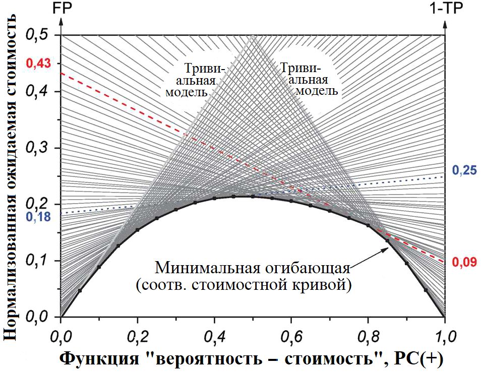 Рис. 5. Пример получения стоимостной кривой. Каждая прямая линия соответствует точке на ROC-кривой. Например, красная штриховая иния соответствует точке с чувствительностью (TP), равной 0,91, и разности «1 – специфичность» (FP), равной 0,43 [378]
