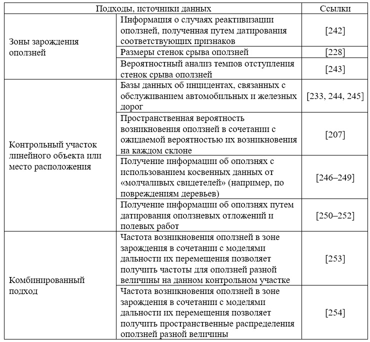 (количеством атмосферных осадков, интенсивностью дождей, силой землетрясения) и величиной многократного возникновения региональных оползневых событий (MORLE – multiple occurrence of regional landslide events), которая определяется либо общим числом оползней, либо, предпочтительно, плотностью распределения оползней на рассматриваемой территории (то есть количеством оползней на квадратный километр) [255]. Такие зависимости были получены для некоторых задокументированных случаев сильных ливней [121] и землетрясений [105]. Зависимости «величина – частота» также могут быть установлены на основе анализа аэрофотоснимков или спутниковых изображений, полученных через известные промежутки времени. Эти зависимости могут быть справедливы на региональном уровне, но не для какого-либо конкретного склона или субрегиона. Важно отметить, что при анализе путем вышеупомянутых региональных подходов не учитывается дальность перемещения оползней (см. таблицу 10).