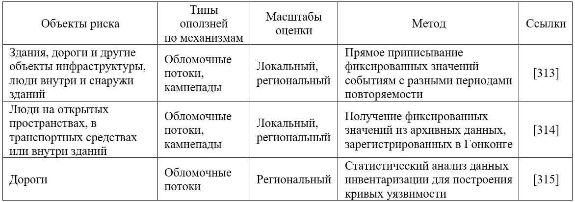 Эвристические (основанные на суждениях экспертов) методы обычно дают дискретные значения для диапазона интенсивностей оползней. Основываясь на экономической ценности зданий, дорог и других объектов инфраструктуры в заданном районе, авторы работы [313] установили фиксированные значения уязвимости в зависимости от периода повторяемости обломочных потоков и камнепадов. Таким же образом они определили значения уязвимости для людей внутри и снаружи зданий. Для людей, находящихся на открытых пространствах, в транспортных средствах или в зданиях в оползнеопасных зонах, на основе наблюдений за реальными событиями авторы публикации [314] дополнительно получили значения, которые могут быть использованы для оценки рисков в Гонконге.