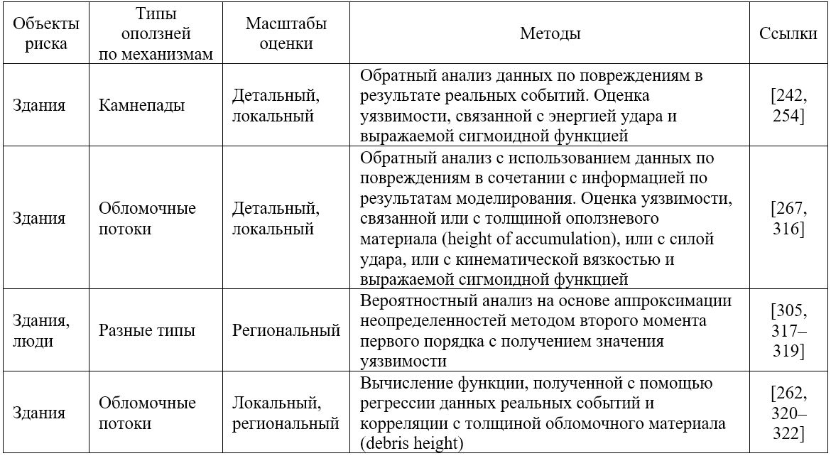 Несмотря на то что проводились обширные исследования по количественной оценке оползневой опасности, разработки по анализу последствий и оценке уязвимости были ограниченными. Далее будут описаны различные виды ущерба от разных типов оползней для разных объектов риска и приведены указания по выбору подходящих методов оценки уязвимости в зависимости от объекта риска, типа оползня и масштаба анализа.