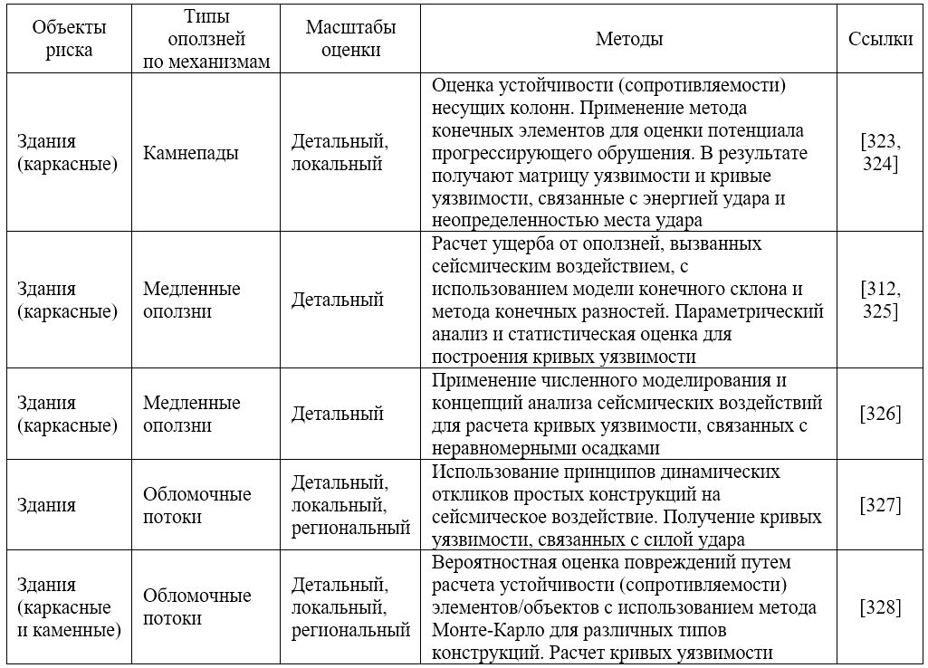 Авторы статей [312, 325] разработали аналитический метод оценки уязвимости железобетонных зданий, подверженных воздействию медленных оползней, вызванных землетрясениями. Кривые уязвимости были получены с помощью определения пиковых ускорений грунта или перманентных смещений в скальном основании, находящемся в сейсмически активной зоне, и вероятности превышения каждого предельного состояния на основе двухэтапного численного моделирования в несвязанной постановке. Этот метод применим к различным типам грунта, геометриям склонов и конфигурациям зданий, что позволяет явно учитывать разные источники неопределенности. В работе [326] также были рассчитаны кривые уязвимости в зависимости от неравномерных осадок железобетонного каркасного здания.