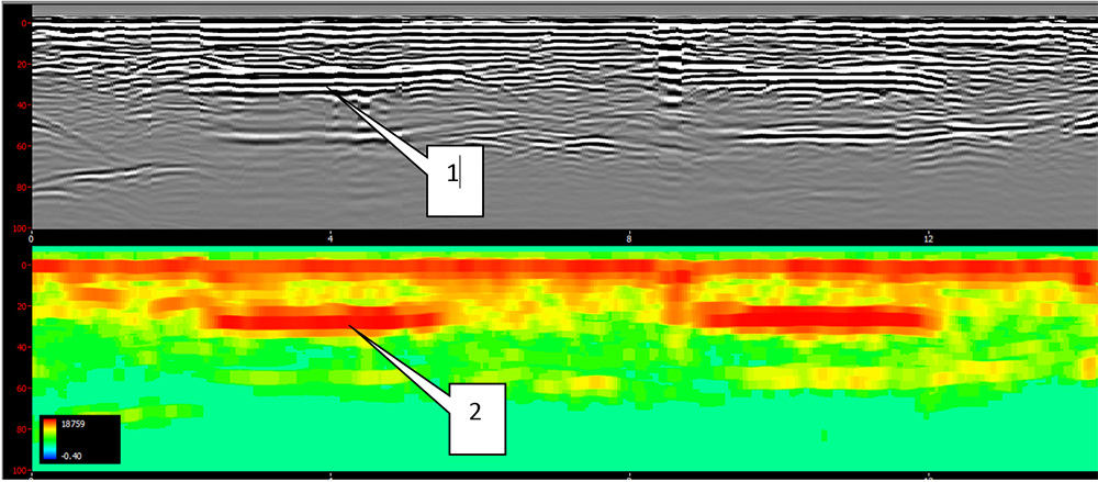 Рис.6. Георадарный профиль (1) и его изображение с помощью атрибута максимальной амплитуды (2) для определения глубины и геометрических размеров плит, являющихся фундаментом несущих колонн