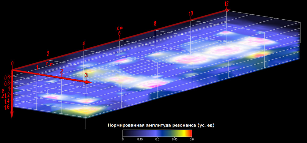 Рис.4. Пример дефектограммы, представленной в трёхмерном виде. Плита короля шлюза. Максимумы нормированной амплитуды резонанса соответствуют трещинам и дефектам