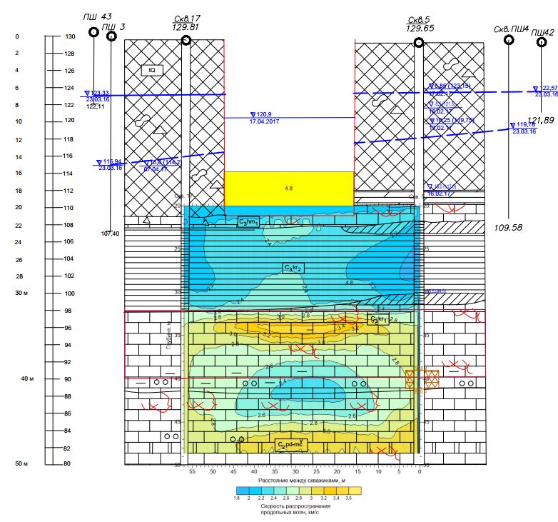 Рис.3. Результаты скоростной акустической томографии под днищем шлюза
