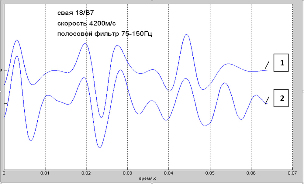 Рис.2. Результат решения динамической задачи для акустического поля в свае. 1 – полевая сейсмограмма; 2 – результат решения динамической задачи