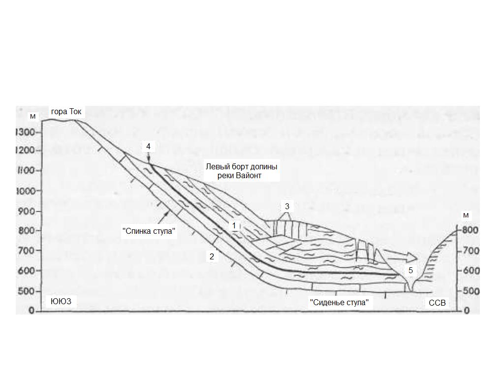 Рис. 6. Геологический разрез левого берега водохранилища Вайонт до катастрофы (по [9]): 1 – пачка мергелей и мергелистых известняков, склонных к оползанию; 2 – частично водоупорный прочный доломитизированный известняк; 3 – трещины; 4 – плоскость смещения будущего оползня с тонкими прослоями глинистых грунтов вдоль нее; 5 – ущелье реки Вайонт и чаша водохранилища; стрелка – направление движения оползня