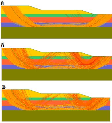 Рис. 3. Огибающие критических поверхностей скольжения по итогам вероятностного анализа с использованием метода RLEM при детерминированном коэффициенте устойчивости Kу = 1,17 и длине пространственной корреляции: a – 5 м; б – 15 м; в – 30 м
