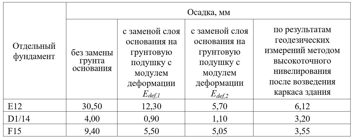Упоминавшиеся выше статические испытания штампами проводились до бетонирования на участках будущих отдельных фундаментов E12, D1/D14 и F15 на уровнях подошв. Эти участки находились вблизи точек геодезического мониторинга VD9, VD2 и VD12, что позволило сравнить расчетные и фактические осадки. Результаты сопоставлены в таблице 2.