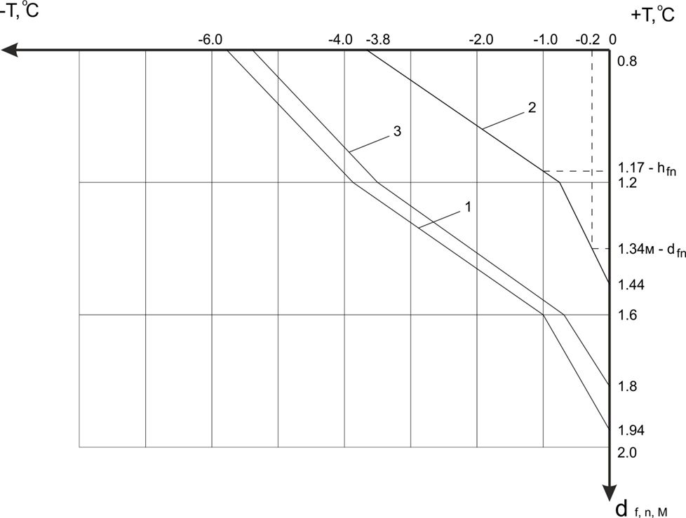 По графику на рисунке 1 определяем глубину промерзания под фундаментом с учетом Tbf = -0,2°С — dfn = 1,34 м; толщина твердомерзлого грунта под фундаментом для суглинка при Т=-1,0°С составляет 1,17 м; глубина заложения водопровода при влажности грунта W=0,3 для оголенной поверхности при коэффициенте Yс1=0,74, Yс2=1,0, dfn = (1,94+0,5)*0,74*1,0 = 1,8 м. Глубину промерзания грунта под проездами при В>4hfn принимаем dfn =1,34, с учетом начала промерзания Tbf = -0,2°С.