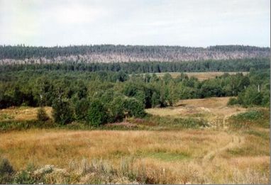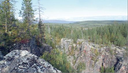 Рис. 4. Сейсмогенный разломный уступ высотой около 60 м (пересекает весь снимок на заднем плане), находящийся недалеко от деревни Палтега Медвежьегорского района Республики Карелия [14]
