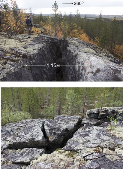 Рис. 3. Сейсмогенные расколы и трещины зияния в гнейсо-гранитах, нарушающие ледниковую полировку скал в районе поселка Шонгуй на севере Кольского полуострова [5]