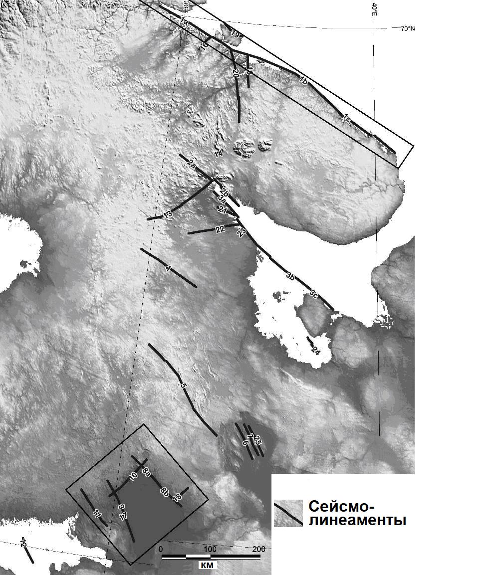 На рисунке 7 представлена карта основных сейсмолинеаментов восточной части Фенноскандинавского щита с выявленными землетрясениями, имеющими магнитуды не менее 6.