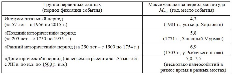 Для Мурманской зоны удалось примерно в одинаковой мере собрать и обработать материалы по инструментальному, «историческому» и «доисторическому» периодам [7]. Результаты исследований наглядно продемонстрировали принципиальную важность использования палеосейсмологического метода оценки долговременной сейсмической опасности и недостаточность применения в этих целях (применительно к Фенноскандинавскому щиту) только данных инструментальных наблюдений и слабо проработанного каталога событий «исторического» периода (табл. 1).