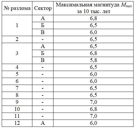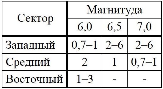По интенсивности проявлений «исторических», «доисторических» и палеоземлетрясений, а также по структурно-кинематическим характеристикам Мурманскую сейсмоактивную зону можно разделить на 3 сектора, в каждом из которых была оценена повторяемость событий по разным магнитудам (табл. 2).