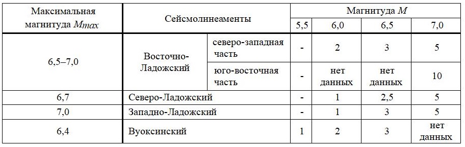 Для более крупных и лучше изученных сейсмолинеаментов удалось выполнить экспертные оценки максимальных магнитуд (Мmax) и периодов повторяемости (T) сотрясений с разными магнитудами (M), в том числе для зоны Ладожского грабена, которая наиболее близка к Санкт-Петербургу и многим особо ответственным инженерным объектам. Она была подразделена на несколько сейсмогенерирующих зон. В таблице 3 для них показаны приблизительные оценки Мmax и Т.