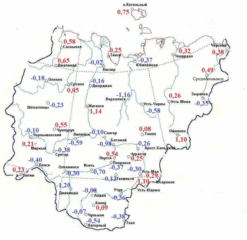 На основании анализа метеорологических данных, находящихся в открытом доступе [5] Ю.Б.Скачковым было установлено повсеместное повышение среднегодовой температуры воздуха в Якутии за последние 50 лет [16] на величину от 1,1 до 3,3°С (рис.5). Это повышение происходит неравномерно во времени и пространстве и обусловлено, в основном, потеплением в зимние сезоны. Вклад летних сезонов менее значителен. В среднем по территории Якутии среднегодовая температура воздуха повысилась на 2,0°С.