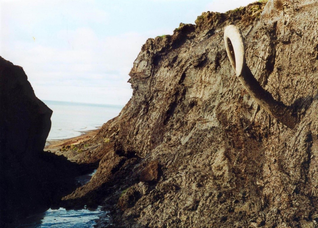 Рис.4. Вытаивающий в разрушающейся береговой толще горных пород бивень мамонта. Фото М.Н.Григорьева