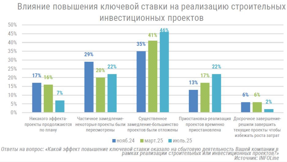 Прежде всего отметим, что специалисты INFOLine провели серию опросов среди ключевых производителей и поставщиков строительных и отделочных материалов, выявляя их реакцию на изменение экономической ситуации. Июльский опрос показал, что высокая ключевая ставка Центрального Банка РФ ощутимо сдерживает инвестиционную и строительную активность.