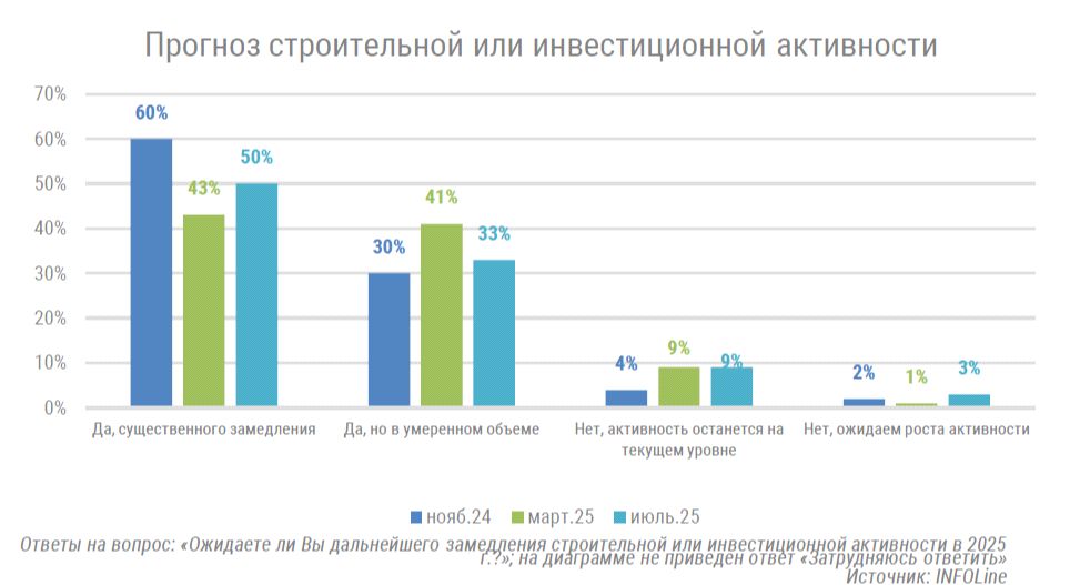 Несмотря на снижение ключевой ставки в июне 2025 г. на 1 п.п. до 20%, среди участников опроса преобладает рыночный пессимизм. По результатам опроса отмечается, что сегодня уже 83% респондентов (на 1 п.п. меньше, чем в марте) ожидают снижения активности в строительной отрасли, причем 50% предрекают значительное замедление, а 33% – умеренное. Из всех участников 9% (на уровне марта 2025 г.) полагают, что ситуация останется стабильной.