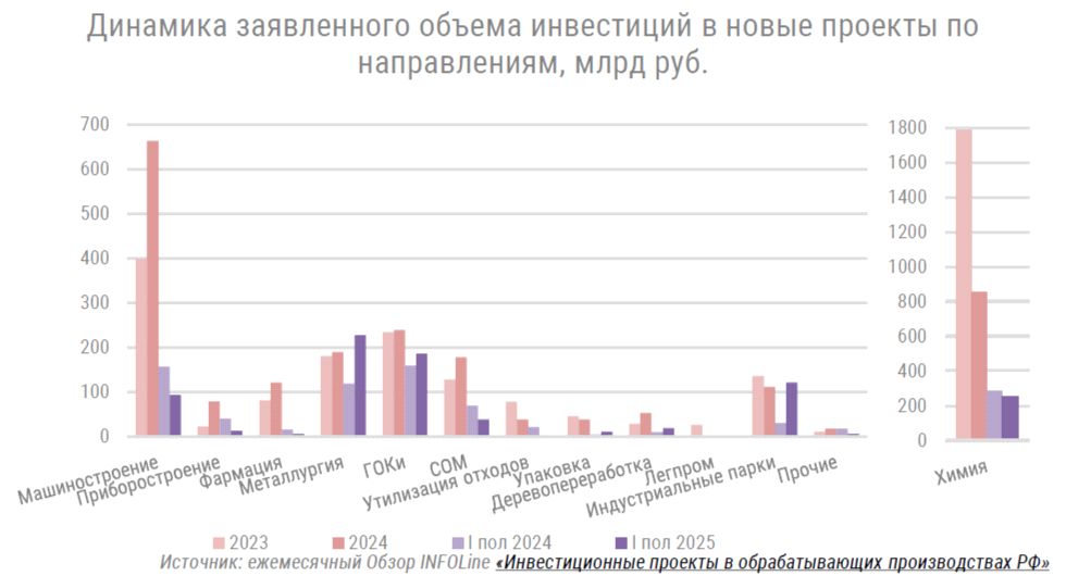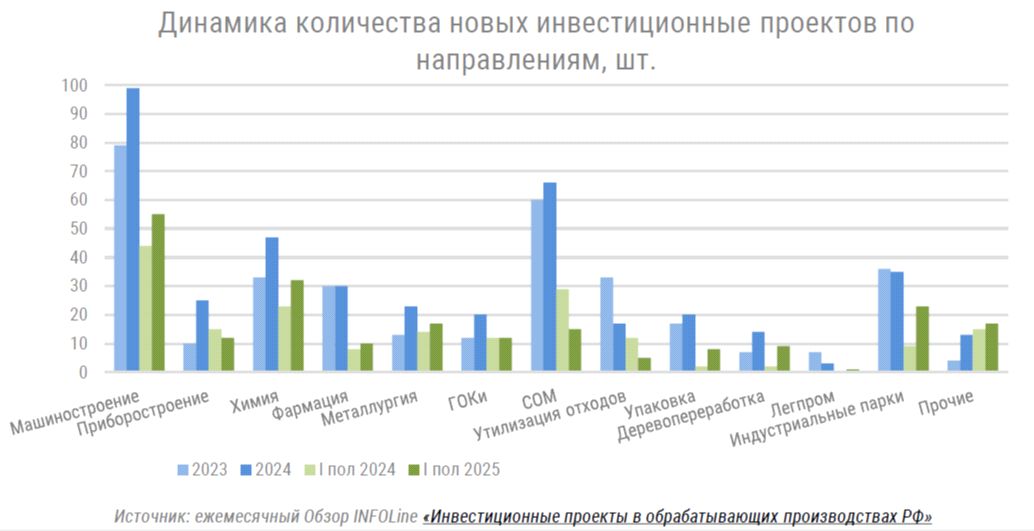 Кроме того, специалисты INFOLine отмечают рост заявленных планов по инвестициям в строительство и реконструкцию обрабатывающих производств в 2025 году по сравнению с I полугодия 2024 года (с 673 до 1302 млрд руб.). Количество новых проектов также увеличилось (с 93 до 109). При этом средний объем инвестиций в реализацию одного проекта почти не увеличился (с 5,3 до 5,8 млрд руб.) при значительном росте стоимости оборудования, строительных и отделочных работ и материалов, что свидетельствует о пересмотре состава затрат или масштабов проектов.