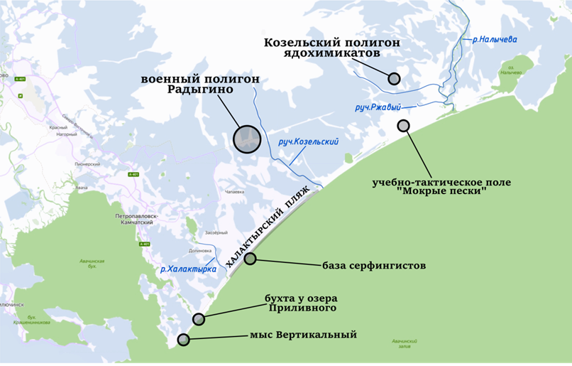 Рис. 2. Основные объекты района Авачинского залива к северу от Авачинской бухты (карта составлена Д.И. Школьным)