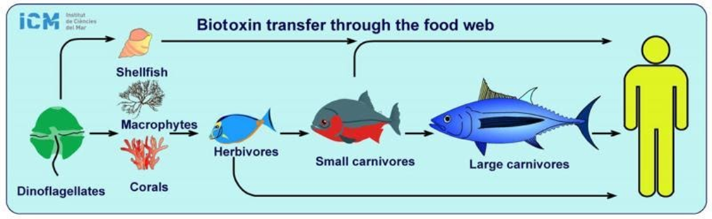 Токсичность Dinophysis – научно подтверждена. Есть масса статей на эту тему. Кроме того, в пробах воды и тканей мидий, отобранных 5 октября 2020 г. и проанализированных сотрудниками ТИБОХ ДВО РАН, установлено наличие токсина метилового эфира окадаевой кислоты, продуцируемого микроводорослями рода Dinophysis. Опасными в этом регионе являются «цветения воды» летом с июня по август, вызванные отдельными жгутиковыми водорослями из динофлагеллят, продуцирующими сильнейший яд нервнопаралитического действия – сакситоксин. К человеку он попадает через пищевые цепочки, которые имеют очень жесткие проявления: съел краба – обжег рот. Такими историями сегодня полон Петропавловск-Камчатский. Заражение человека может произойти в случаях употребления в пищу двустворчатых моллюсков (особенно мидий), так как в процессе фильтрационного питания планктоном моллюски накапливают в своем теле яд, содержащийся в микроводорослях. Первичными накопителями нейротоксинов динофлагеллят являются не только моллюски, такие как мидии, устрицы, гребешки, но и зоопланктон, а также травоядные рыбы, то есть пелагические животные, обитающие в толще воды. Причем аккумулировать яды, а следовательно, быть токсичными, эти организмы могут не только в период «цветения динофлагеллят», но и тогда, когда визуально «красные приливы» не наблюдаются, но токсичные водоросли находятся в достаточно высокой концентрации. А сама проблема типичная – читаем научные статьи и находим массу исследований на тему токсичных эффектов динофлагеллят: они попадают в трофические цепи и двигаются к человеку (рис. 6).