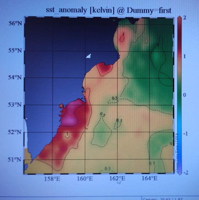 Рис. 7. Карта аномалий температуры воды сентября 2020 года. Все восточное побережье Камчатки – красная зона. Здесь повышены температуры воды по сравнению с нормой на несколько градусов (карта составлена В.В. Коломейцевым)