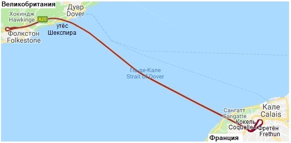 Рис. 1. Изображение на карте трассы Евротоннеля под самой узкой частью Ла-Манша – проливом Па-де-Кале (по [29])