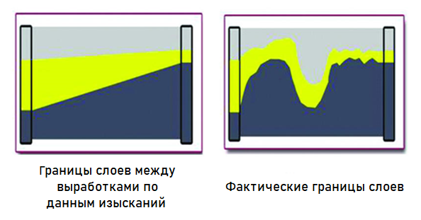 Рис. 3. Пример субъективного отражения границ слоев грунта по данным изысканий на основе информации из горных выработок и возможного несоответствия фактическому напластованию [4]