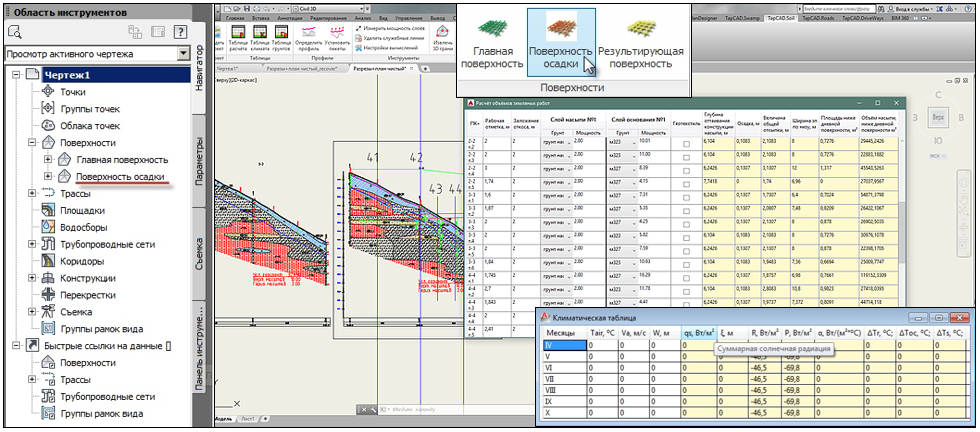 после этого любые изменения в исходных данных приводят к автоматическому переопределению расчетных параметров и перестроению поверхности осадки.
