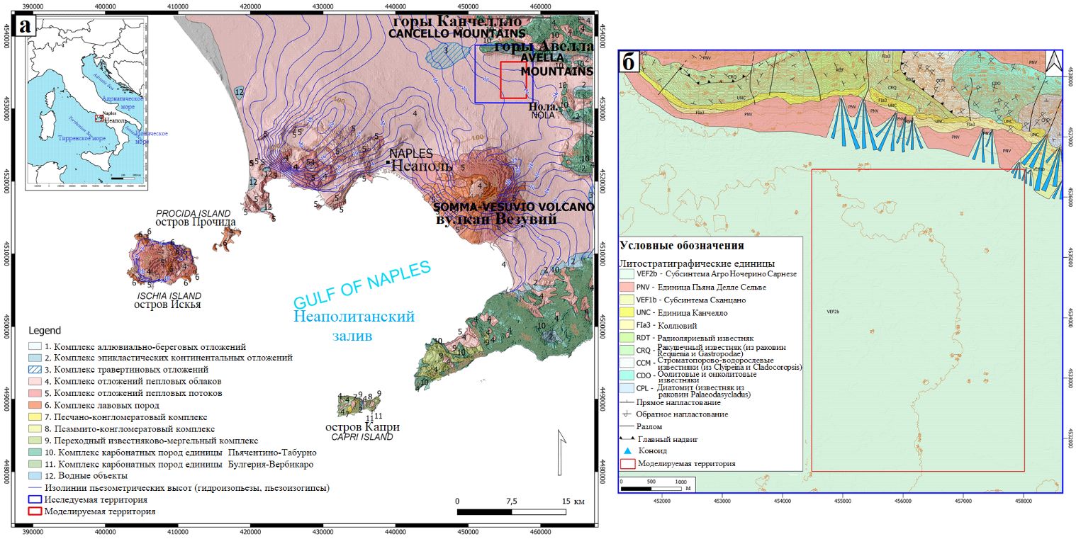 Основные геологические особенности этой территории можно разделить на две группы. В первую входят коренные мезозойские литостратиграфические единицы карбонатной платформенной формации, образующие горы Канчелло и Авелла, которые граничат с исследуемой территорией на севере и на востоке. Вторая группа включает четвертичные отложения, образованные переходными (от морских к континентальным) фациями, связанными с положительными гляциоэвстатическими колебаниями, которые происходили в течение среднего-верхнего плейстоцена, и пирокластические отложения пеплопадов и пепловых потоков [53, 54], возникавших в результате интенсивной вулканической деятельности 116 тыс. лет назад (кампанский серый туф, [55]) и 15 тыс. лет назад (неаполитанский желтый туф, [56]).