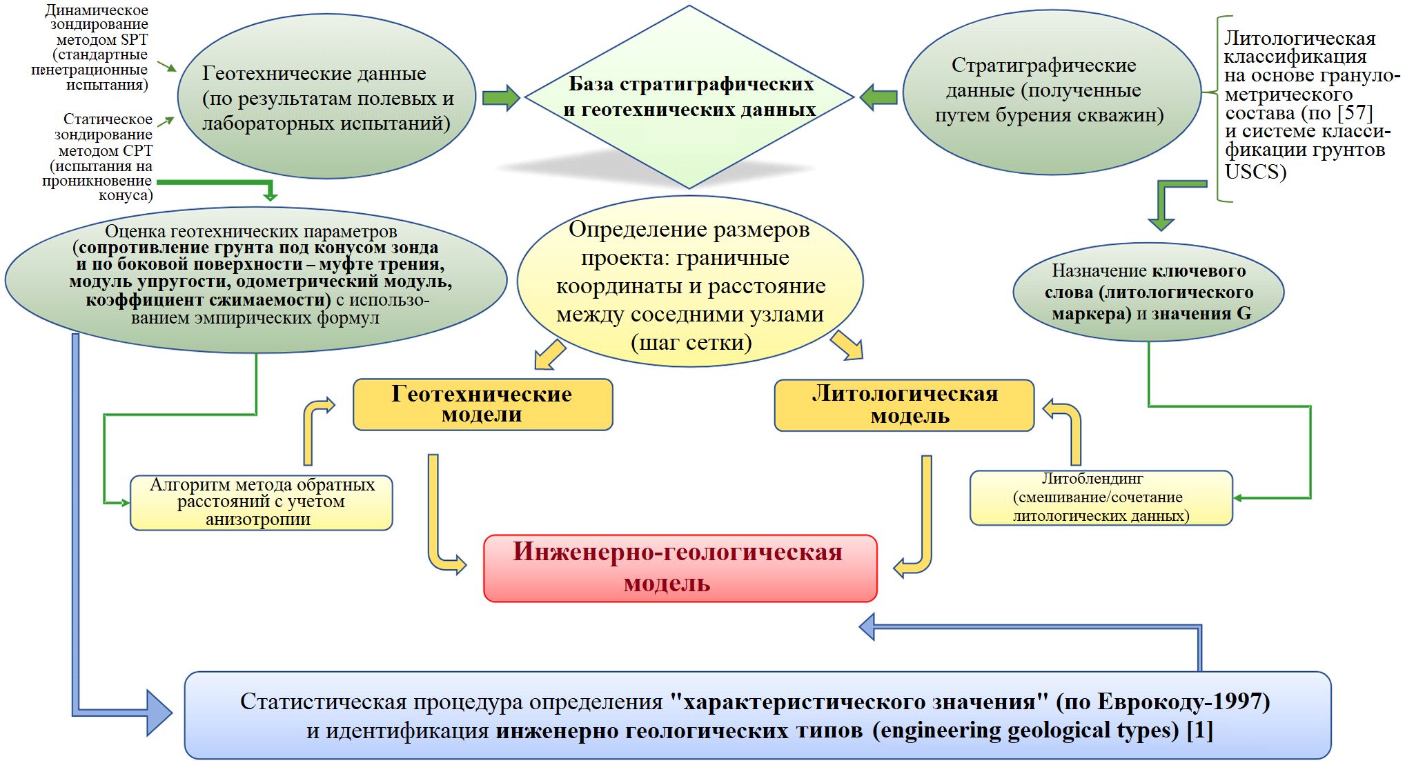 Рис. 3. Блок-схема использованного методологического подхода (с точки зрения редактора перевода, показанный подход вызывает вопросы, поскольку авторы переведенной статьи разделяют как геотехнические данные, так и геологические/литологические модели и создают отдельно две модели, утрачивая суть общего инженерно-геологического закона по В.Т. Трофимову и не понимая смысла и объема инженерно-геологического массива. – Ред.)