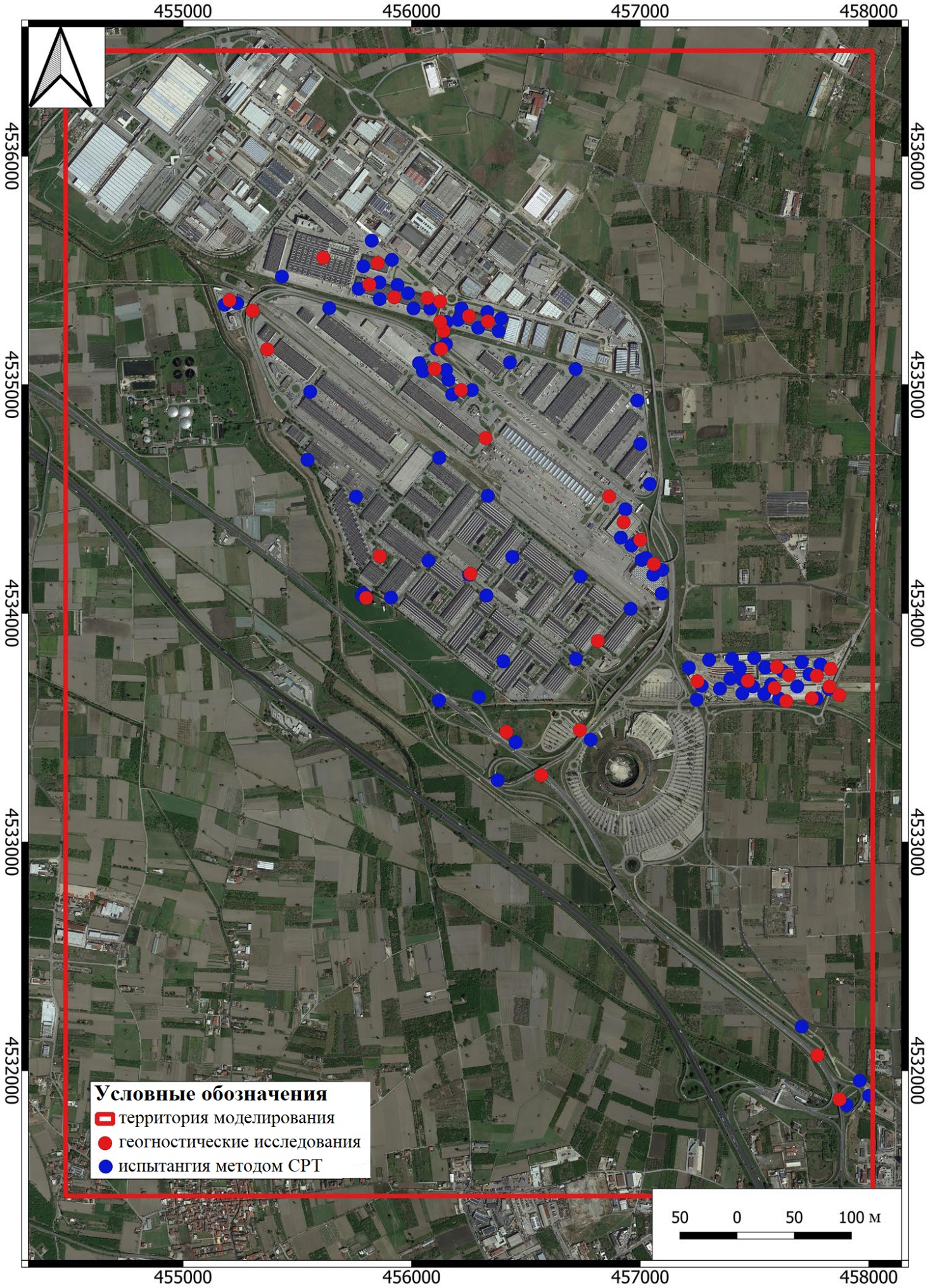 Рис. 4. Карта территории моделирования с указанием мест расположения скважин и проведения статического зондирования методом CPT