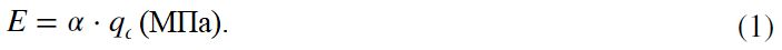 1. Формула Де Бира [59], основанная на корреляционной связи между модулем упругости E и сопротивлением под конусом зонда (qc) с эмпирическим коэффициентом α, значение которого назначается на основе характера испытанного грунта [60]: