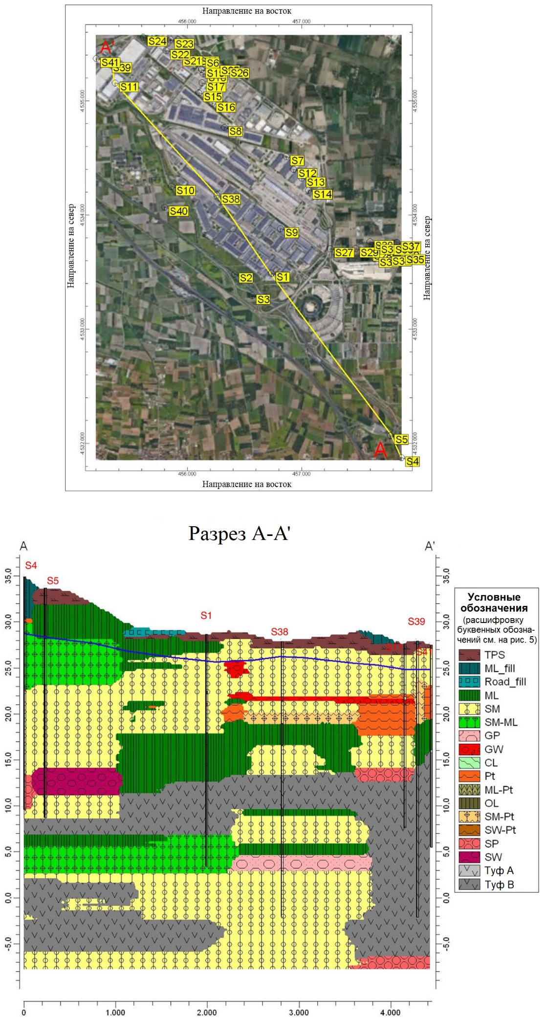 Из 3D литологической модели был получен ряд двумерных изображений исследуемого грунтового основания (subsoil). Например, на рисунке 6 показан разрез A-A’ (от точки изысканий S4 на юго-востоке рассматриваемой территории до точки изысканий S41).